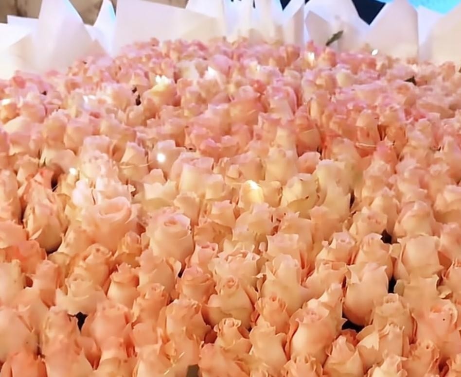 钟丽缇还在个人社交平台分享了朋友赠送的一束巨型粉色玫瑰——整整9999朵,视觉冲击力极强,将甜蜜氛围推向顶点。
